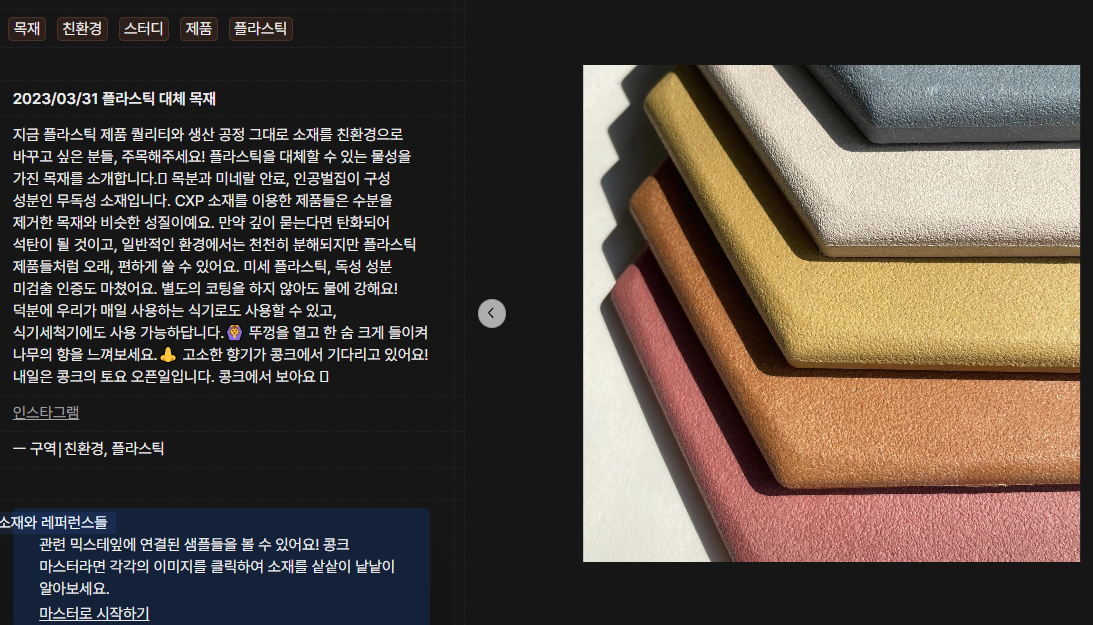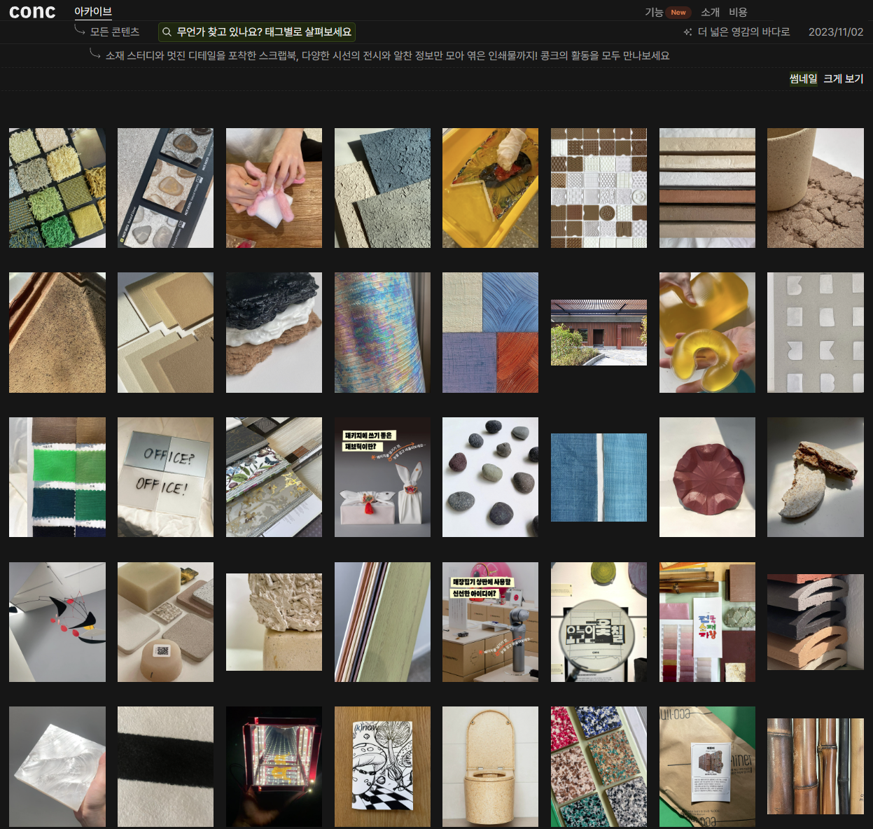 서론이 길었는데 보고있는 건축 잡지에서 "소재 라이브러리 콩크"라는 문구를 봤다. 다양한 질감의 소재를 소개해주는데 아주 마음에 드는 것이 많았다. 뭐하는 곳인지 찾아봤는데 범상치 않은 곳이다.