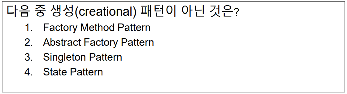 - Creational: 생성에 관련된 작업을 클라이언트가 직접 갖는게 아니라 다른 객체 주는 것 (new없이도 객체 생성 가능)
