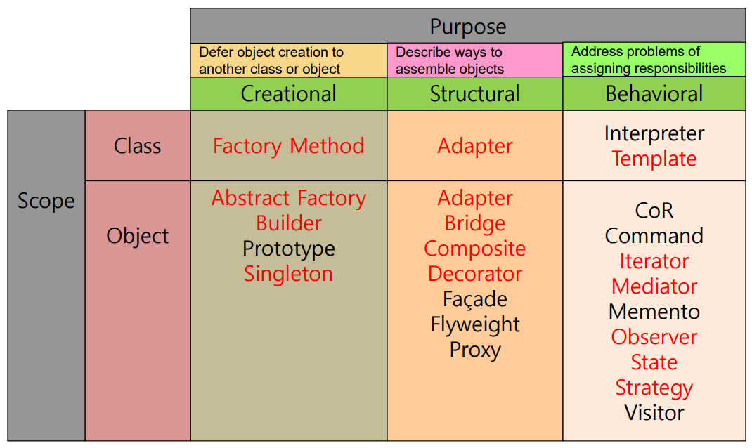- Behavioral: 어떤 클래스가 어떤 책임을 가질 것인가 또는 어떻게 커뮤니케이션 할 것인가를 표현한 패턴