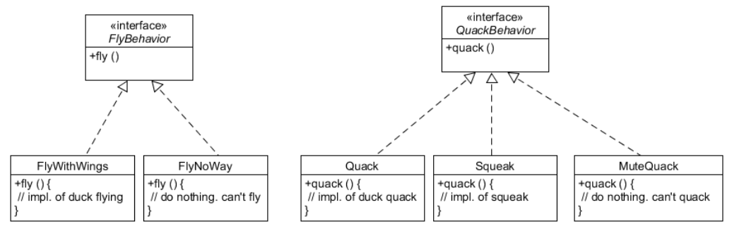 public interface FlyBehavior { public void fly(); } public class FlywithWings implements FlyBehavior { public void fly() { System.out.println("I'm Flying!!"); } } public class FlyNoWay implements FlyBehavior { public void fly() { System.out.println("I can't fly"); } }public interface QuackBehavior { public void quack(); } public class Quack implements QuackBehavior { public void quack() { System.out.println("Quack") } } public class MuteQuack implements QuackBehavior { public void quack() { System.out.println("<< silence >>"); } } public class Squeak implements QuackBehavior { public void quack() { System.out.println("Squeak"); } }그러면 실제로 오리를 구현할때는 아래와 같다.