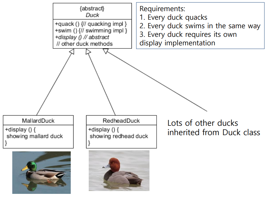 > 상위 클래스에 fly를 구현하면 모든 오리가 날게 되어버린다. (심지어 rubber duck도)
