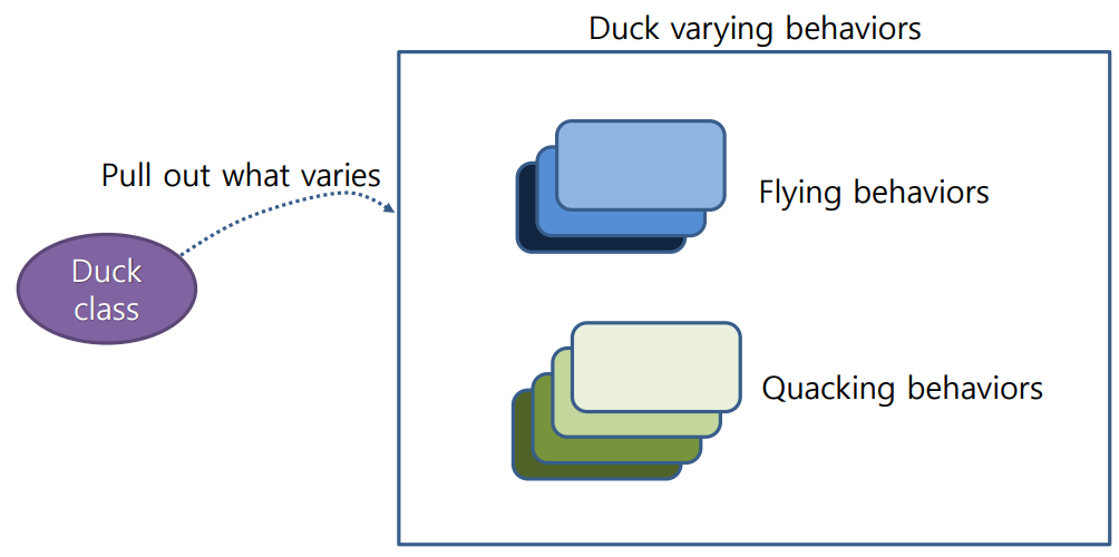 public abstract class Duck { // Object composition FlyBehavior flyBehavior; // Object composition QuackBehavior quackBehavior; public Duck() { } // display는 각자가 구현하도록 abstract로 public abstract void display(); public void performFly() { // delegation flyBehavior.fly(); } public void performQuack() { // delegation quackBehavior.quack(); } public void swim() { System.out.println("All ducks float, even decoys!") } }object composition : 다른 객체에 대한 레퍼런스를 가지고 있는 것