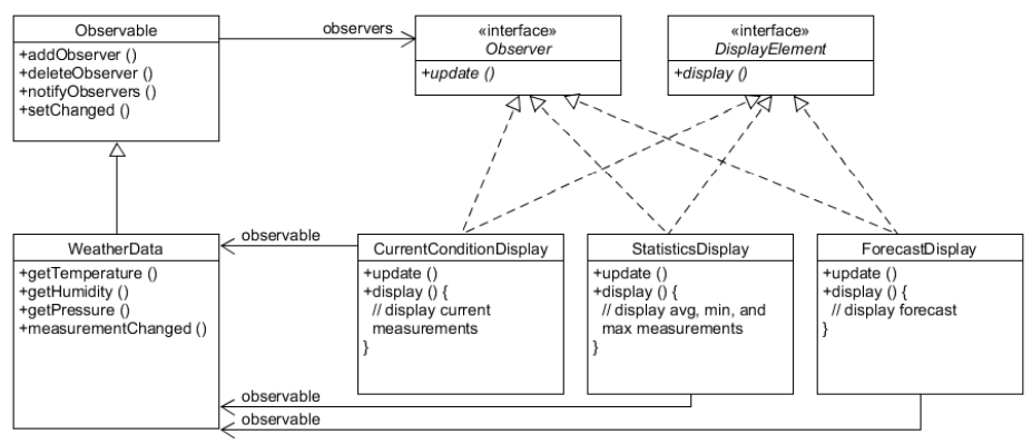 public interface Subject { public void registerObserver(Observer o); public void removeObserver(Observer o); public void notifyObservers(); } public interface Observer { public void update(float temp, float humidity, float pressure); } public interface DisplayElement { public void display(); }ConcreteSubject