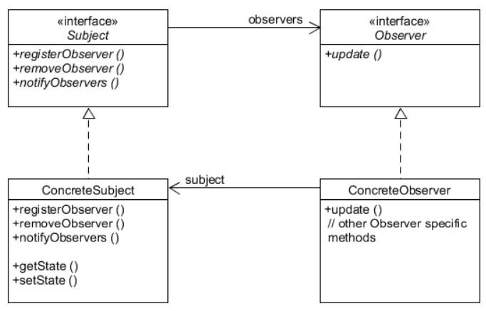 - Observer쪽은 update API만 제공하면 된다. (ConcreteObserver에서 구현)