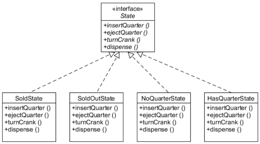 public class GumballMachine { final static int SOLD_OUT = 0; final static int NO_QUARTER = 1; final static int HAS_QUARTER = 2; final static int SOLD = 3; int state = SOLD_OUT; int count = 0; public GumballMachine(int count) { this.count = count; if (count > 0) state = NO_QUARTER; } public void insertQuarter() { if (state == HAS_QUARTER) { .. } public void ejectQuarter() { if (state == HAS_QUARTER) { ..그러나 변경에 자유롭지 못하므로 좋은 방식이 아니다.