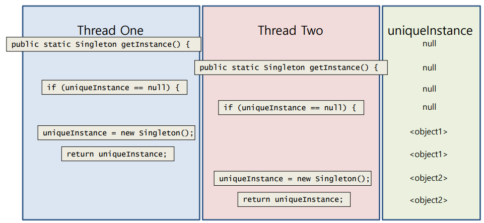 public class Singleton { private static Singleton uniqueInstance; // other useful instance variables private Singleton() {} public static Singleton getInstance() { // 한번만 생성되도록 함 if (uniqueInstance == null) { uniqueInstance = new Singleton(); } return uniqueInstance; } // other useful methods }# Singleton on Multi-threads