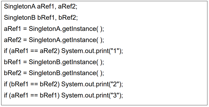 SingletonA 클래스와 SingletonB 클래스가 각각 싱글톤 패턴으로 구현되었다고 가정할 때, 다음 코드의 수행결과를 쓰시오.