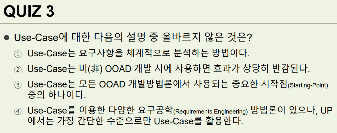 정답: 2번. Use Case는 요구사항을 뽑아내기 위한 것이므로 OOAD뿐만 아니라 C나 C++에서도 효과적이다.