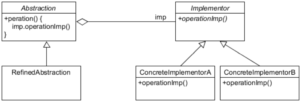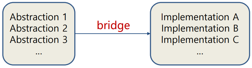 커플링을 제거하기 위해 abstraction과 implementation을 분리하고 bridge로 연결한다.