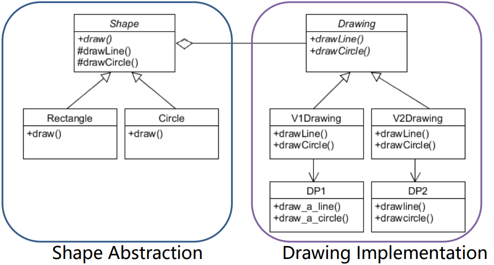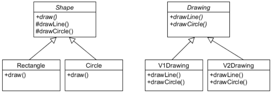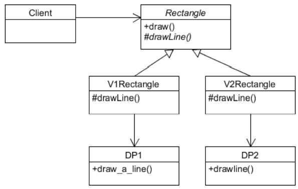 class V1Drawing extends Drawing { public void drawLine(double x1, double y1, double x2, double y2) { DP1.draw_a_line(x1,y1,x2,y2); } public void drawCircle(double x, double y, double r) { DP1.draw_a_circle(x,y,r); } } class V2Drawing extends Drawing { public void drawLine(double x1, double y1, double x2, double y2) { DP2.drawline(x1,x2,y1,y2); } public void drawCircle (double x, double y, double r) { DP2.drawcircle(x,y,r); } }아래는 concrete class의 implementation이다.
