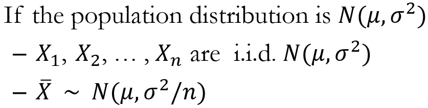 모집단이 정규 분포를 따를 때는 아래와 같이 표본 평균이 다음 분포를 따른다.