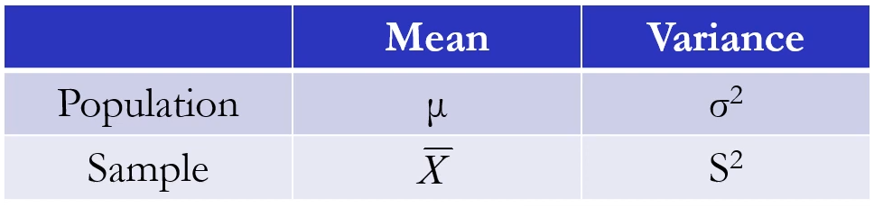 모집단, 표본의 평균과 분산은 아래와 같은 기호를 쓴다.