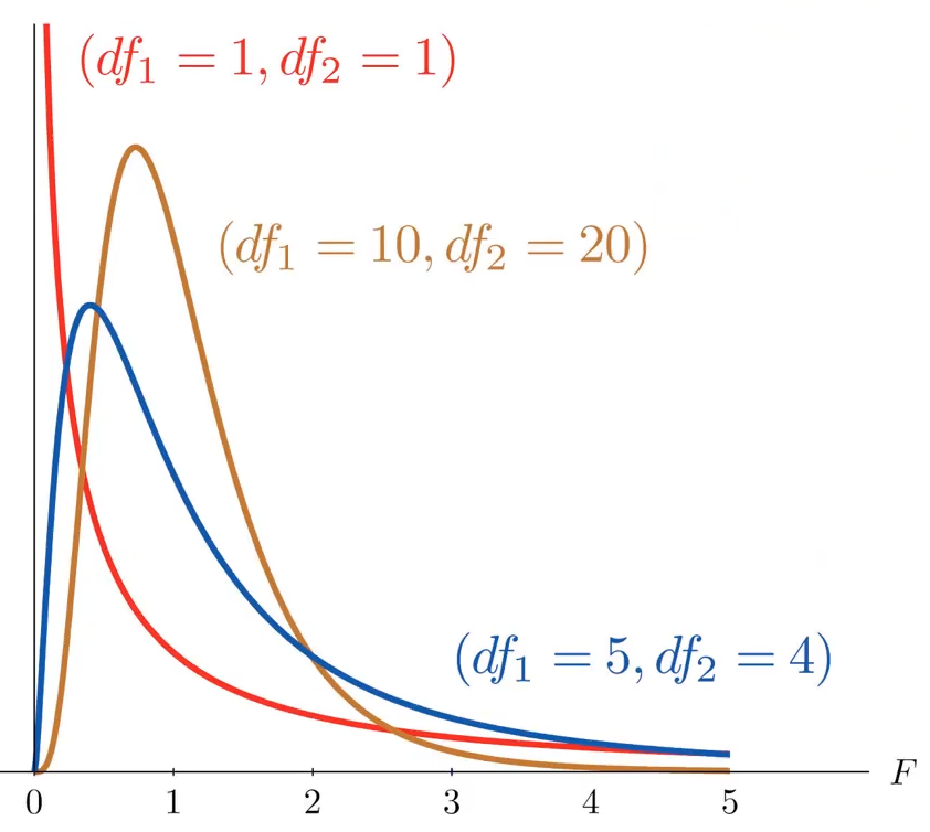 F분포는 아래와 같이 skew된 그래프이고 자유도에 따라 달라진다.