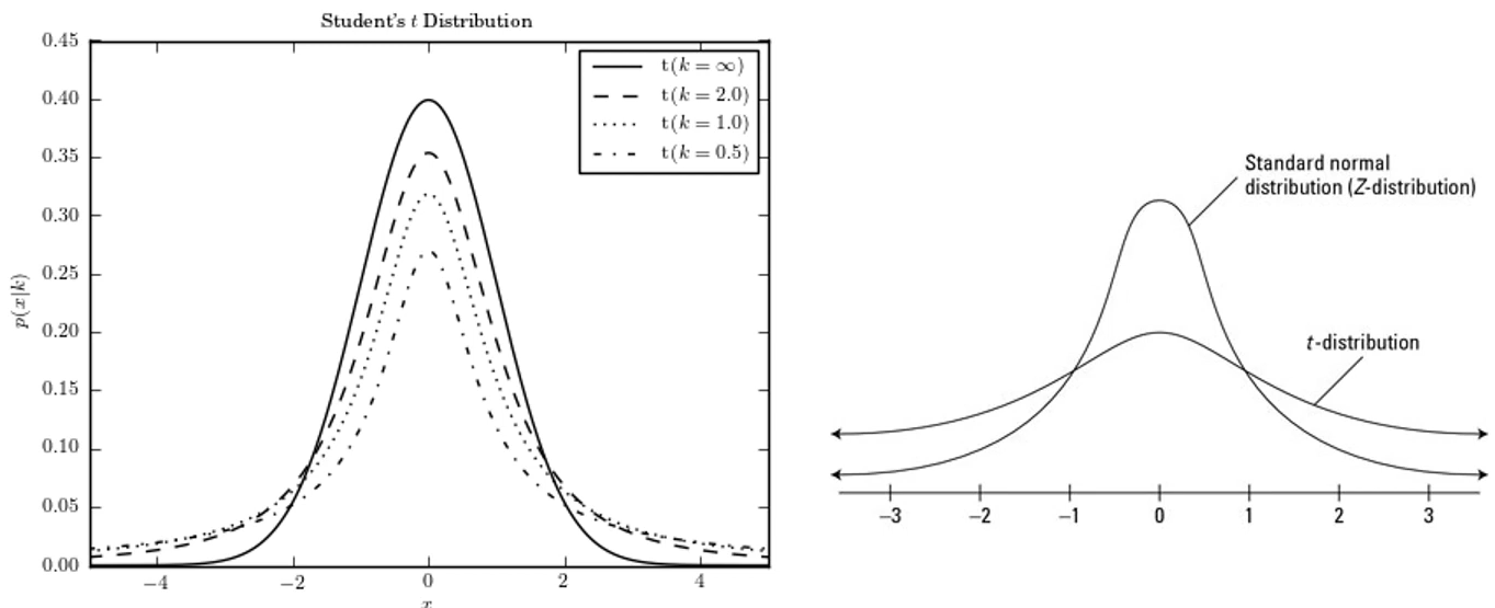 t분포의 기댓값은 0이고 대칭형이며 표준정규분포보다는 꼬리가 더 길다.