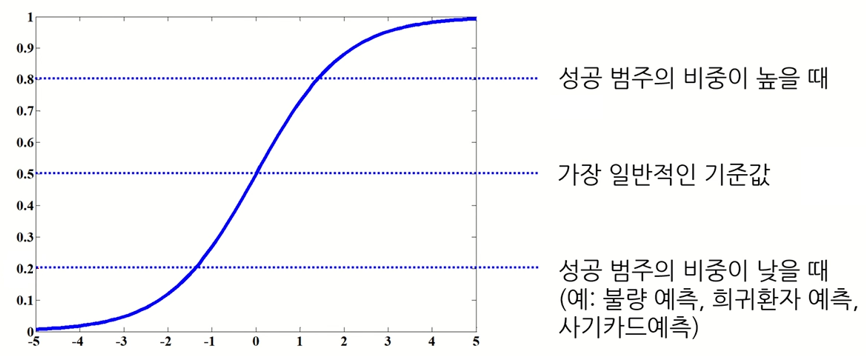 로지스틱 회귀함수는 결국 확률값을 주기 때문에 이진 분류를 위해서는 threshold가 필요하다.