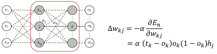 - 계산된 출력노드의 값과 실제 출력변수의 값의 차이를 줄일 수 있도록 은닉층과 출력층 사이의 w값을 업데이트