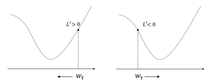 α앞에 마이너스가 있으므로 gradient인 L'가 0보다 크면 weight는 줄어든다.
