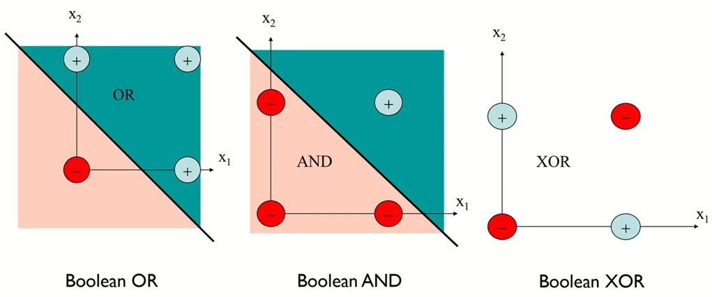 아래 그림에서도 알 수 있듯 XOR문제는 어떤 직선으로도 +, -를 완벽히 구분할 수 없다.