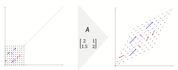 고유벡터는 아래 그림처럼 기존의 방향에 영향을 주지 않는다.