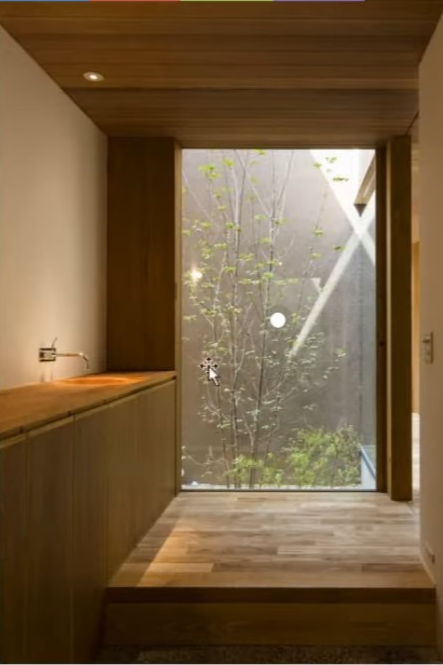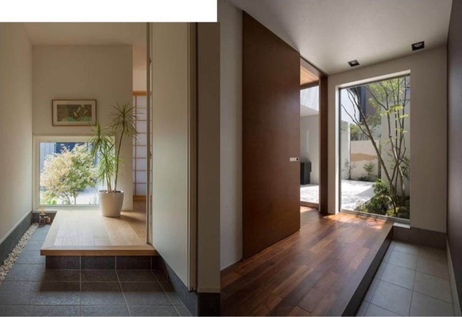 현관은 집의 얼굴이다. 손님이 오면 처음 만나는 공간이다. 아파트보다 넓게 하면서 동시에 고정창을 내서 풍경을 아름답게 하고 싶다. 전체창을 내기 적합하지 않다면 아랫쪽으로 작게 만들어서 밖에 식물을 배치하는것도 좋은 방법이다.