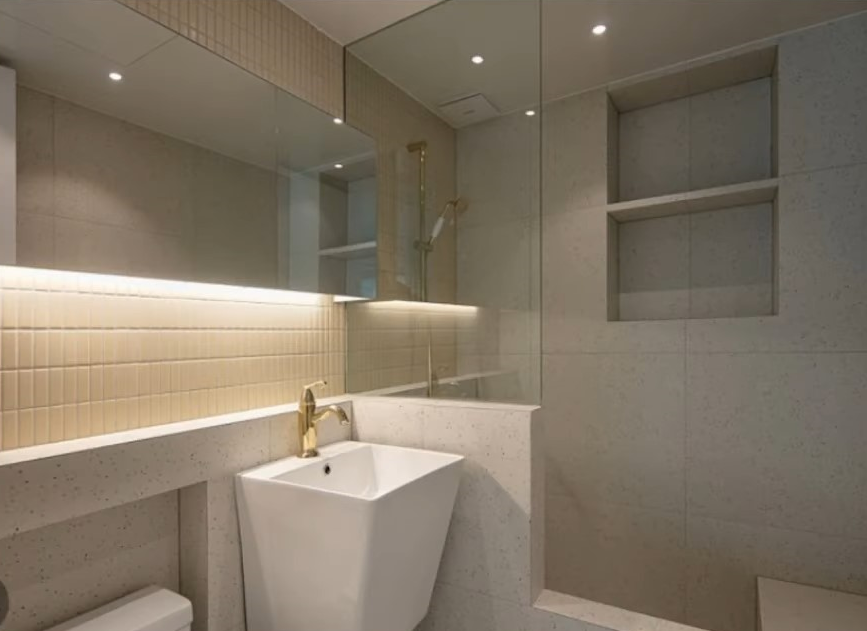 화장실도 마찬가지다. 화장실도 창문을 낼 수 있다. 거울위 정도에 최소한의 조명만 달자. 아래 그림처럼 쓸대없이 매립등, 간접조명 설치하지 말자.
